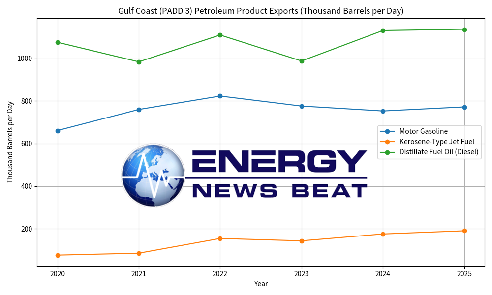 Gulf Coast refineries dominate U.S. petroleum product exports, accounting for the vast majority of distillate, jet fuel, and gasoline shipments overseas. Annual average exports (thousand barrels per day) from PADD 3 show clear upward trends: